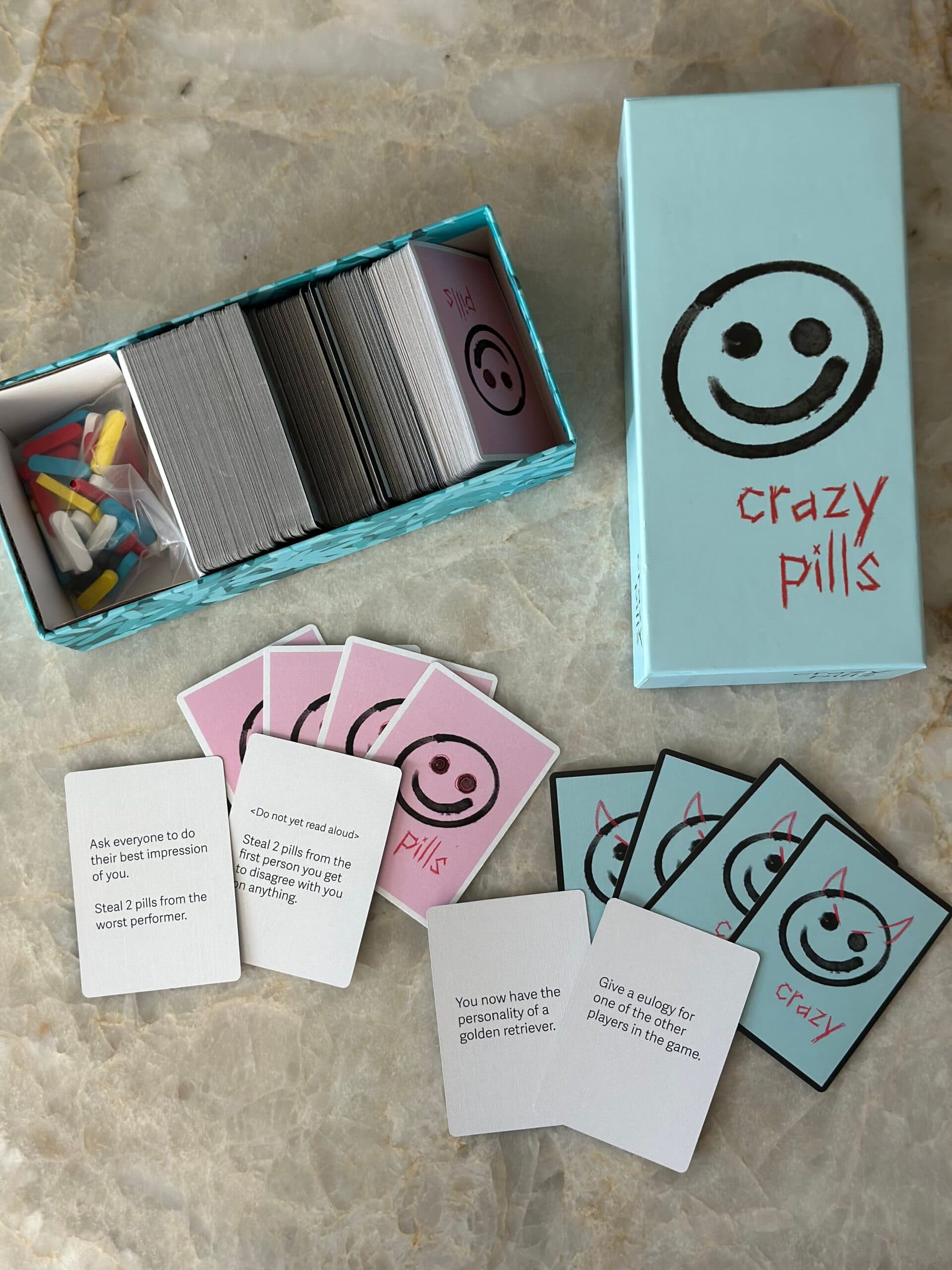 The premise of Crazy Pills is simple and captivating: Players draw crazy cards that provide subtle yet ridiculous behaviors that escalate as the game goes on, and players must steal enough pills to cure themselves of their crazy behaviors.