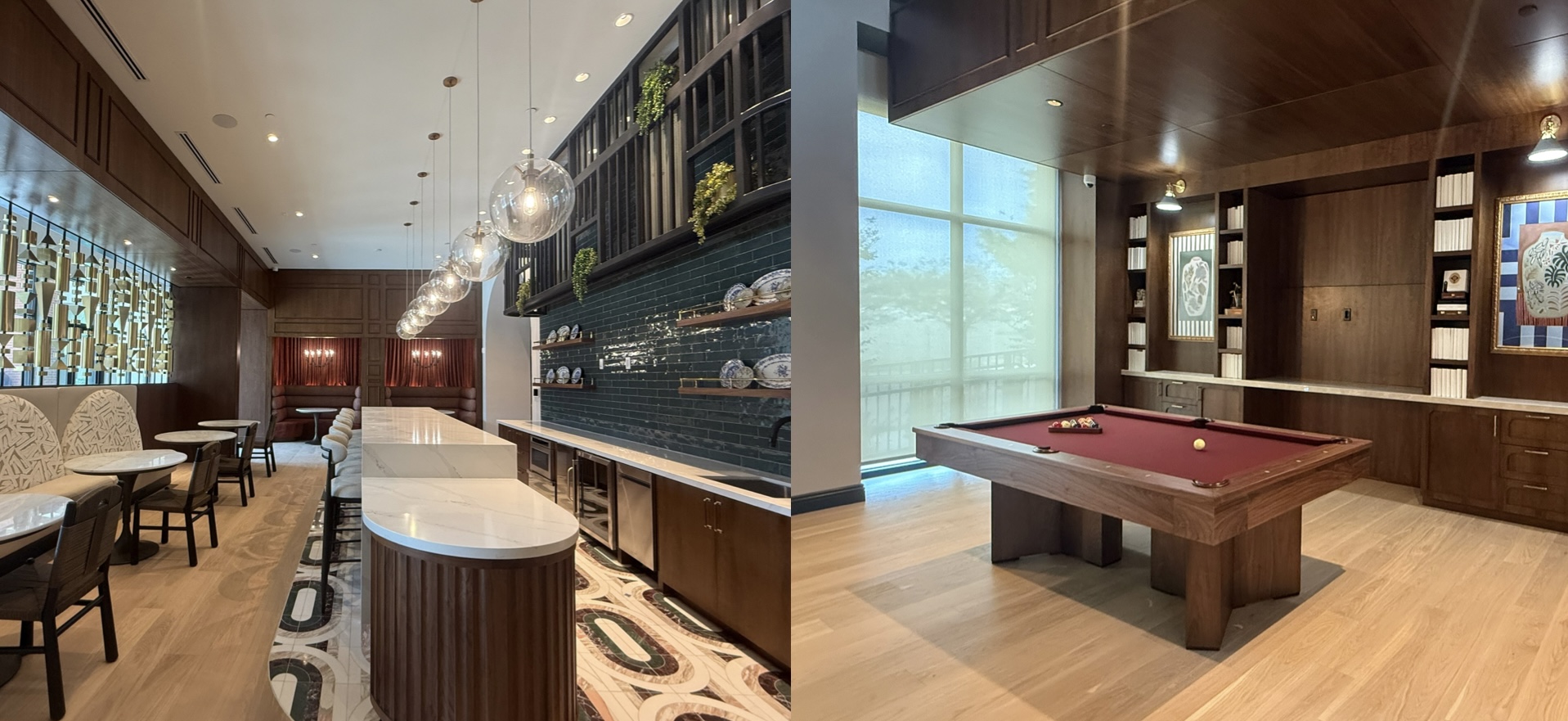 Residents can choose between two interior styles. One features a brighter look with cream-colored cabinets and countertops, gray backsplash and lighter wood flooring. The other style leans darker with brown cabinetry and darker brown flooring. All units include a kitchen island, up-to-date outlets with ports for new electronic chargers and soft-close cabinets and drawers.